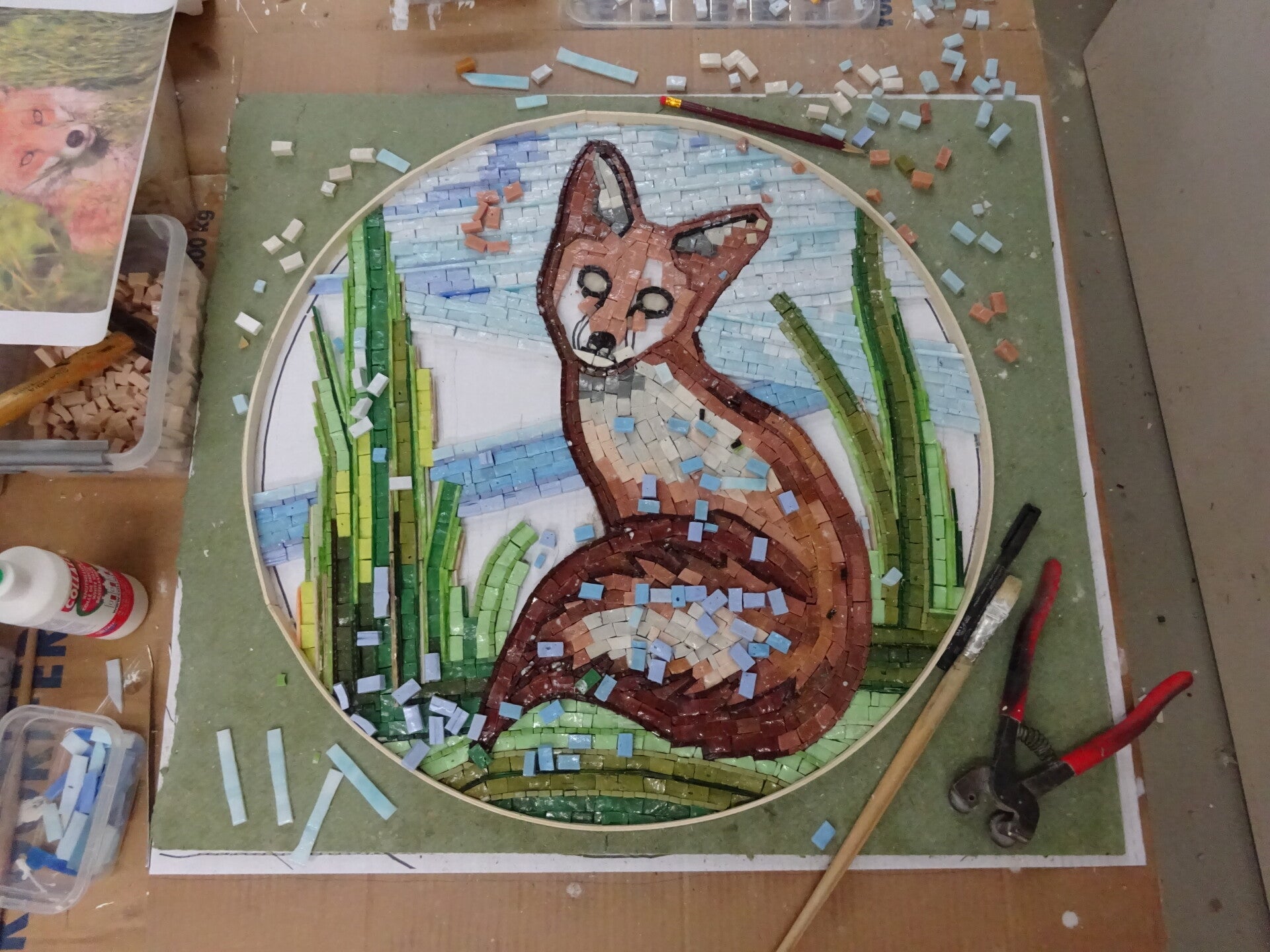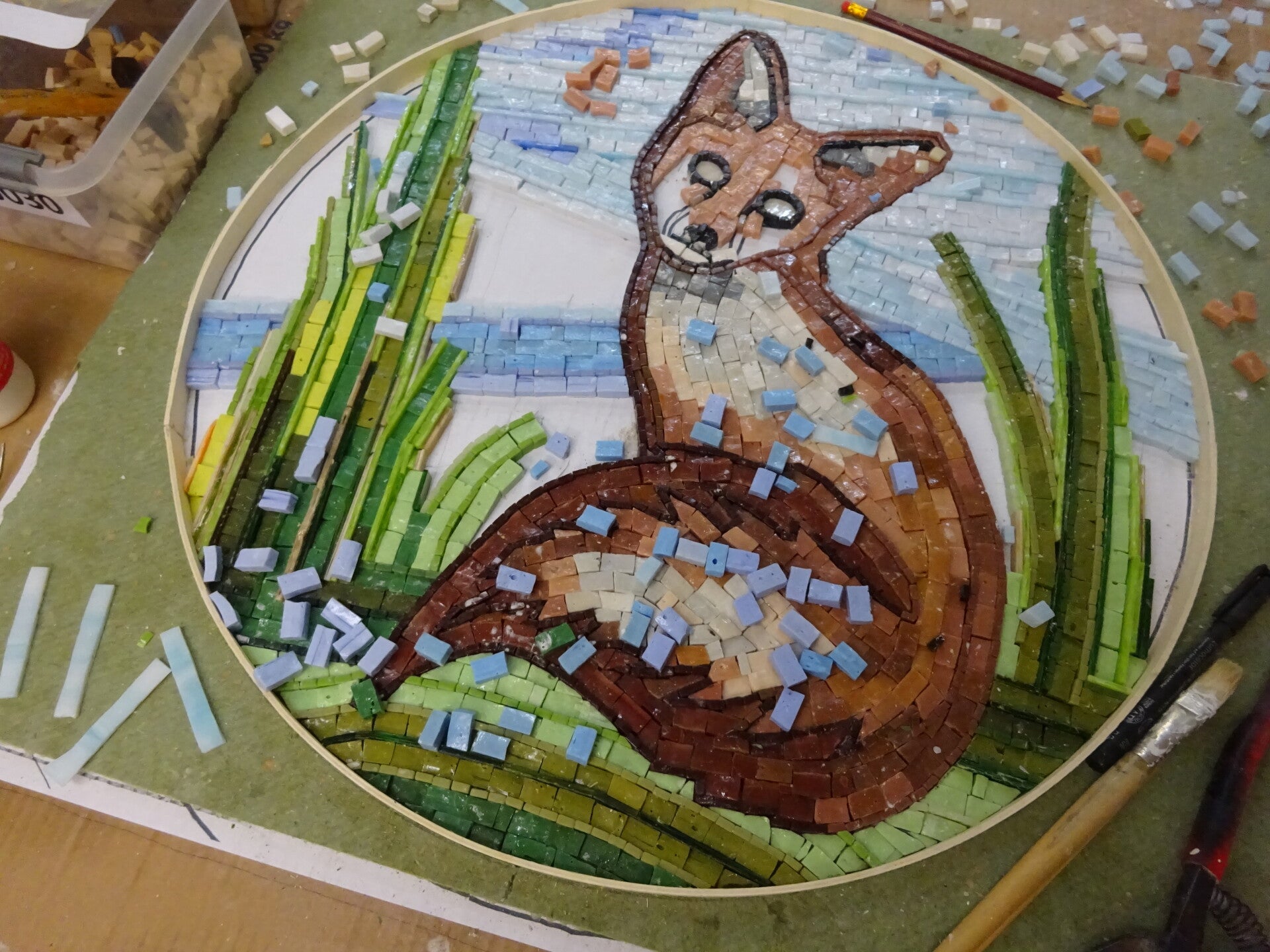 Na uitharding, van het acrylaat, kan het karton, met water, verwijdert worden. Het mozaiek is nu relatief vlak en kan in een lijst geplaatst worden. Eventueel kunnen de voegen nog afgewerkt worden.